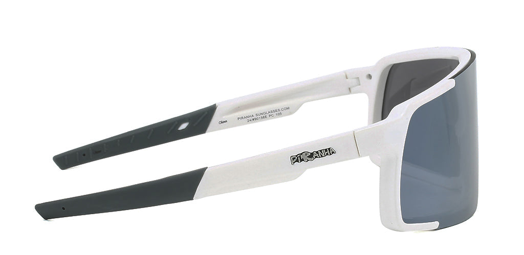 With a cylindrical lens and smooth plastic frames, the Arthur II sports sunglasses are bright white and based on the style of snow goggles. The rectangular shield lens curves around the face in a sports wrap, while the temples have a rubber ear tip for stability while in motion. The white mirror coating over a cool gray lens is the focal point of this sunglass.