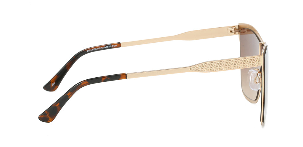 If you love oversize shield sunglasses for women, then you'll flip for the Lodo style by Piranha. With a sleek, curved brow-line and gold square frame, these metal sunglasses are both stylish and comfortable. The ultra-modern shape of the frame is paired with a single gradient brown lens. The curved ear tips are covered with a plastic tortoiseshell pad for your comfort.