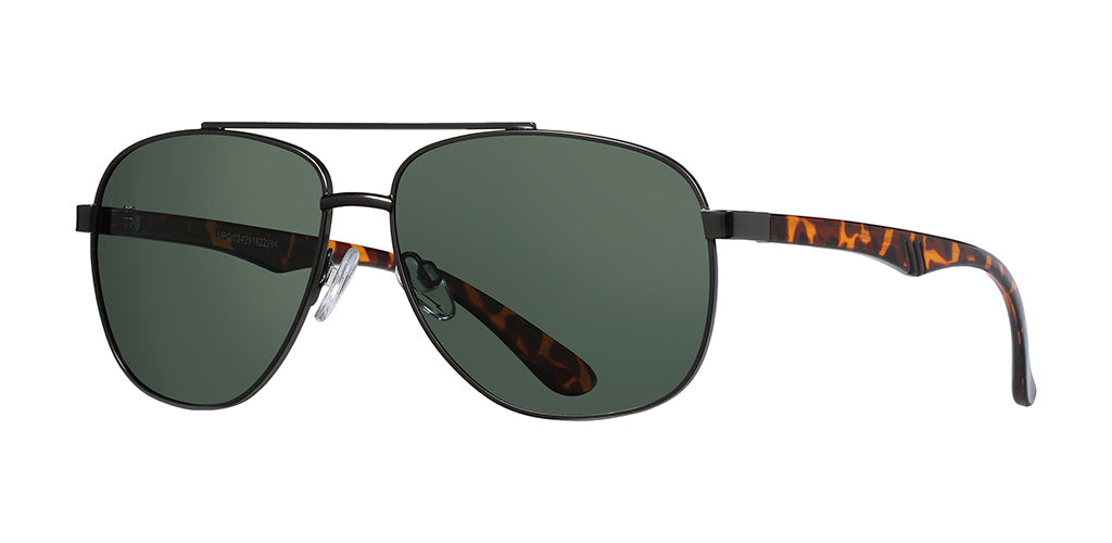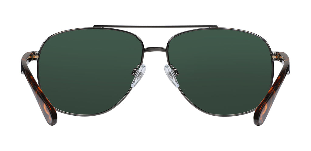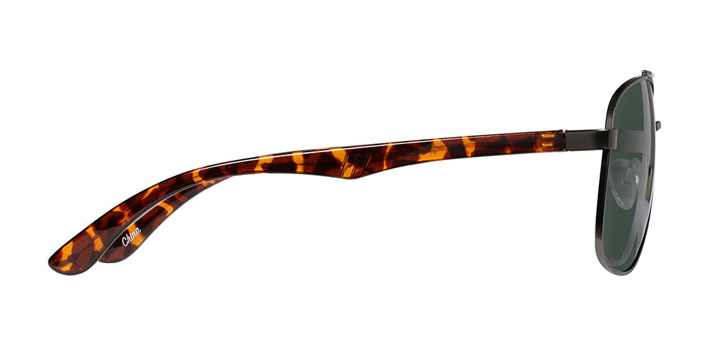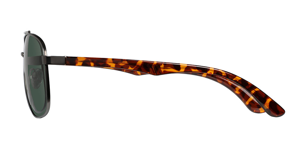 The matte gunmetal gray frame is sleek and durable, paired with tortoiseshell-patterned temples that add a touch of vintage sophistication. The bottle green polarized lenses are a standout feature, reducing glare and enhancing clarity—perfect for outdoor adventures, driving, and sports. The polarized filter blocks harsh horizontal light from reflective surfaces like water, snow, and roads, delivering crisper, clearer vision with 100% UVA/UVB protection.