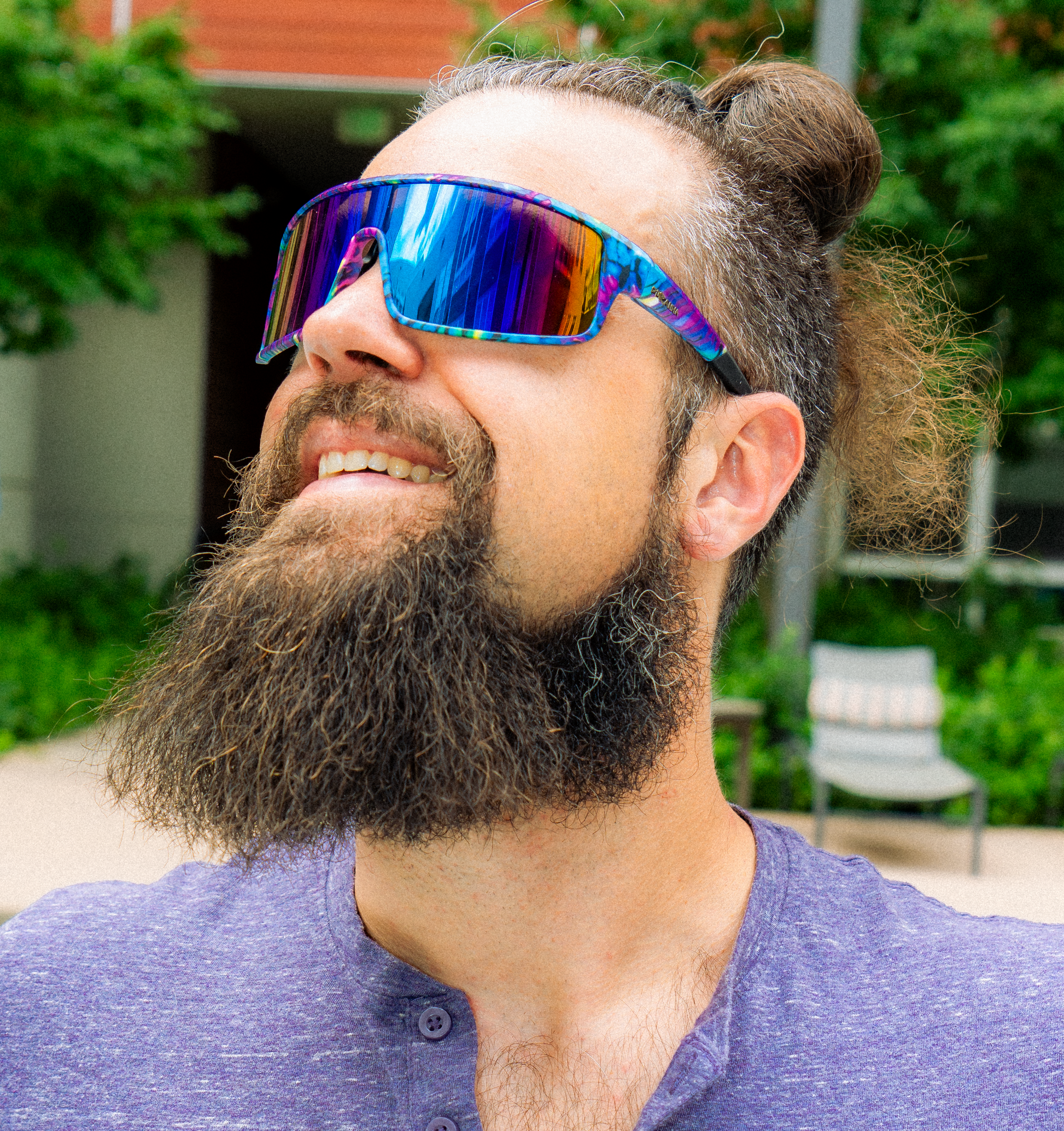 The ear tips are straight and made of ultra-flexible thermoplastic rubber. The extruded bridge is flexible as well to fit higher profiles better. The shield style, like snow goggles, are a unisex style that works well with most faces. The lens is shatter-resistant with a multi-color mirror that goes from a hint of gold on the outer edge to purple and blue in the center. You'll love the look - so find out why these shields are on point and on trend!